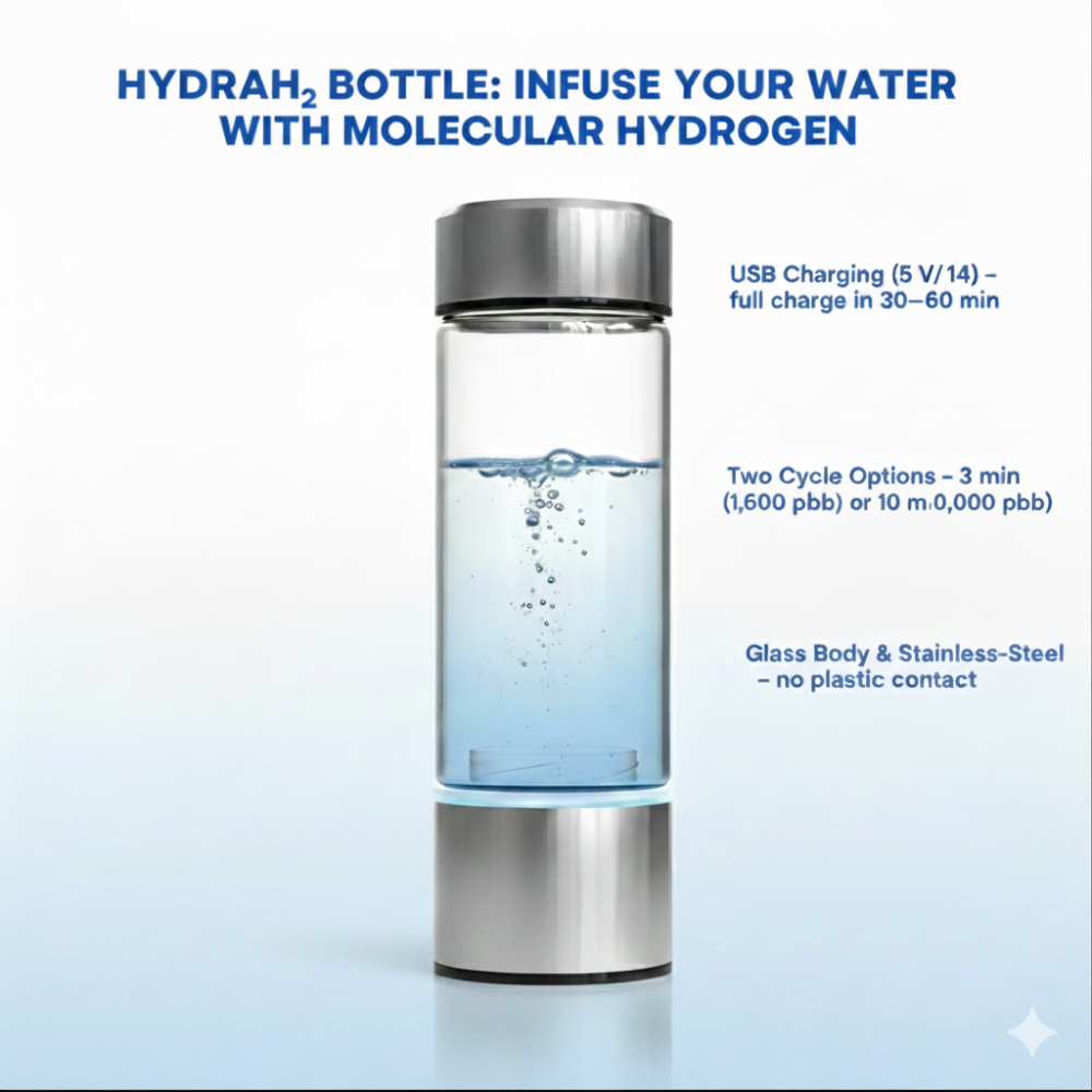 Using cutting-edge PEM and SPE electrolysis, HydraH₂ generates up to 3,000 ppb of molecular hydrogen in water. The glass bottle design with a stainless-steel base ensures no plastic contact, while the lifetime generator filter removes maintenance worries. Automatic venting expels residual gases for pure, safe drinking.